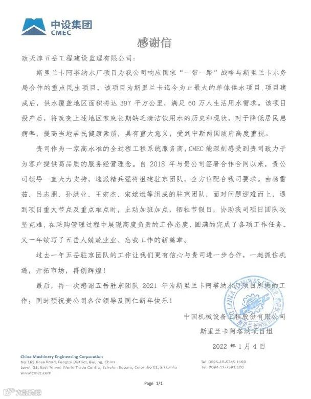 由中汽工程负责监理的斯里兰卡阿塔纳水厂项目收到合作方表扬信,信中表达了对双方团队合作和高质量工作的赞许,并提出了对未来继续合作、再创辉煌的期盼。