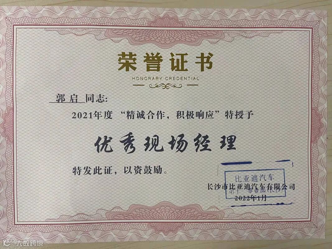 2021年,比亚迪长沙基地焊装柔性线体全年导入5款全新车型及多款改款车型,其中焊装柔性线生产方案在生产过程中得到了充分的验证。项目团队成员本着“攻坚克难、使命必达”的精神在项目建设过程中不畏艰难、拼搏奋斗。基于该项目实施过程中的优异表现,比亚迪长沙基地向中汽工程颁发了“最佳供应商奖”、“最佳安全管理团队奖”、“优秀项目经理奖”、“优秀现场经理奖”等多个奖项。