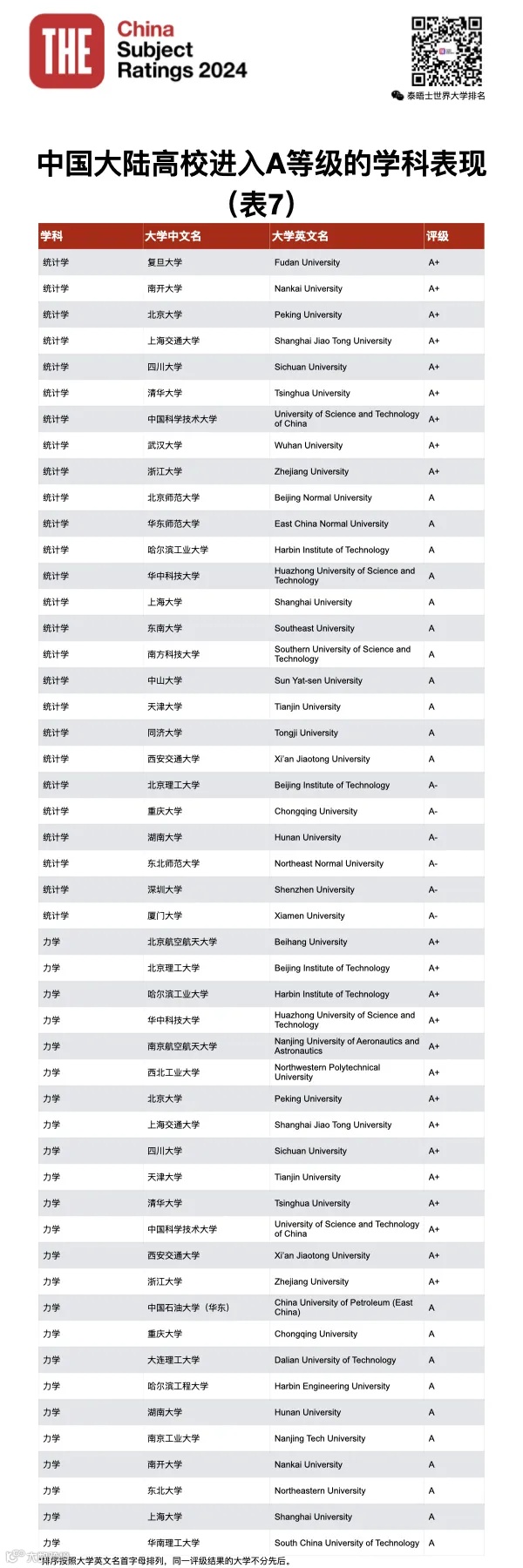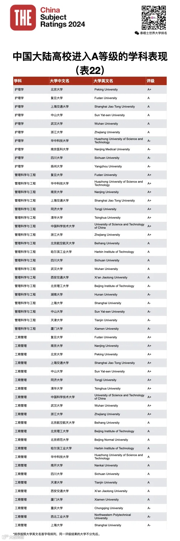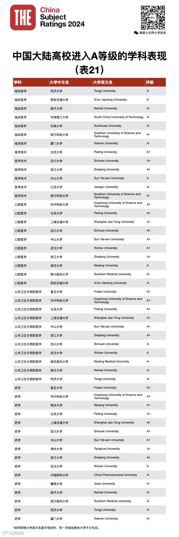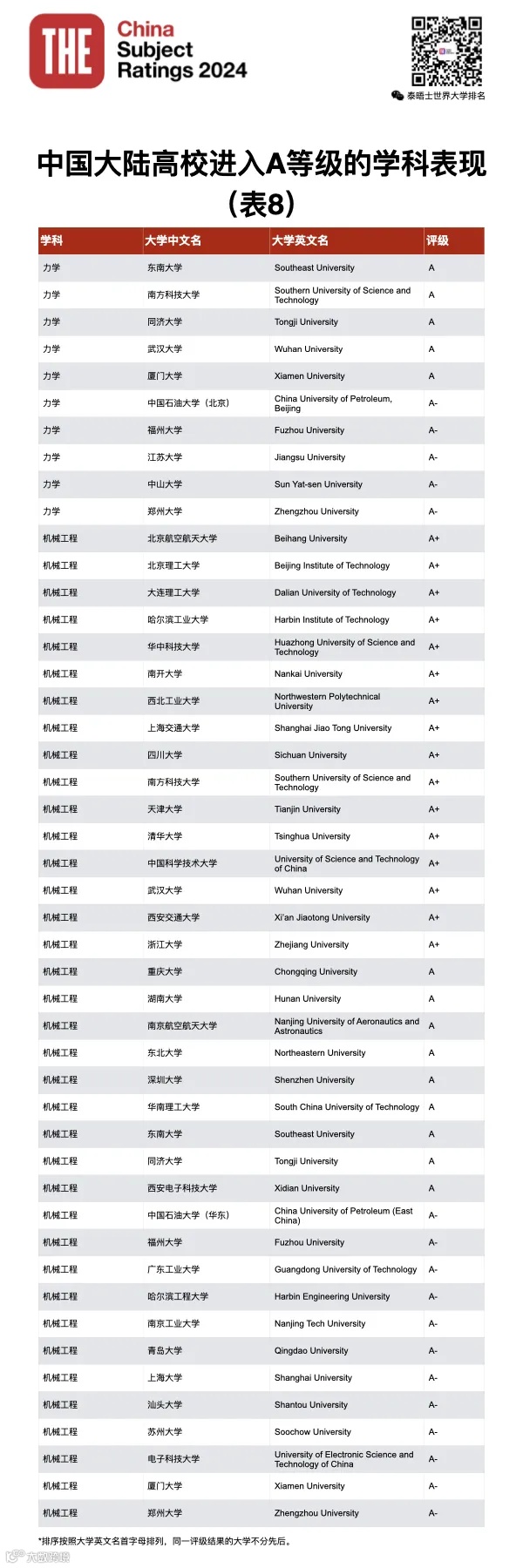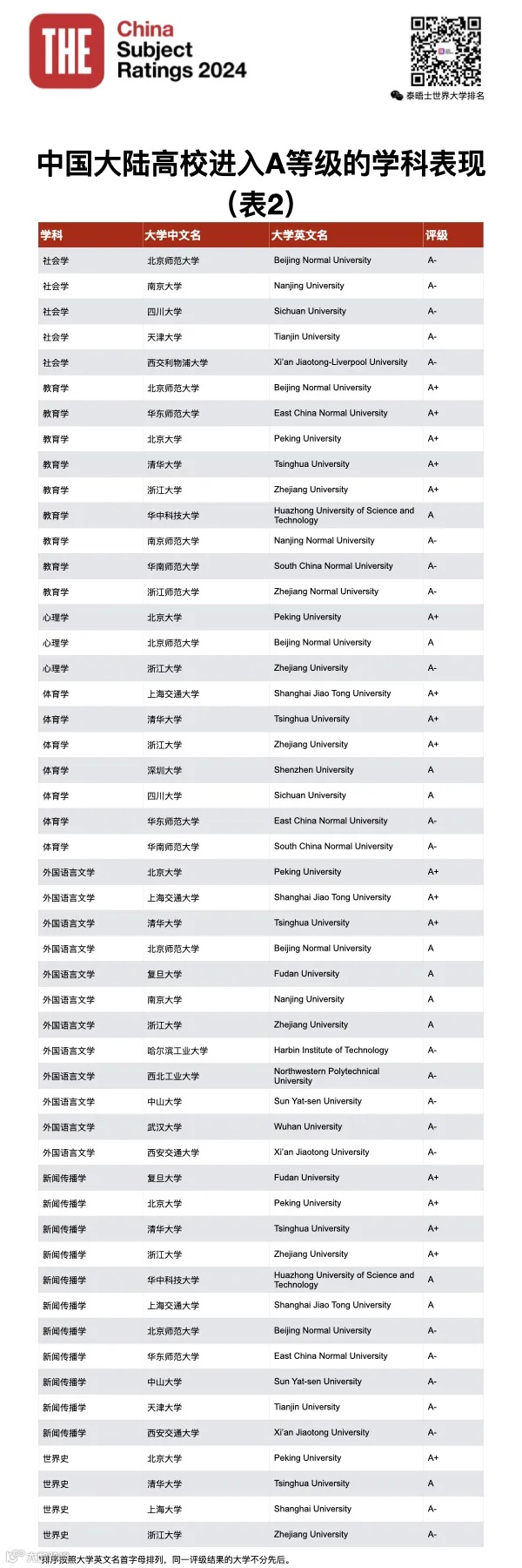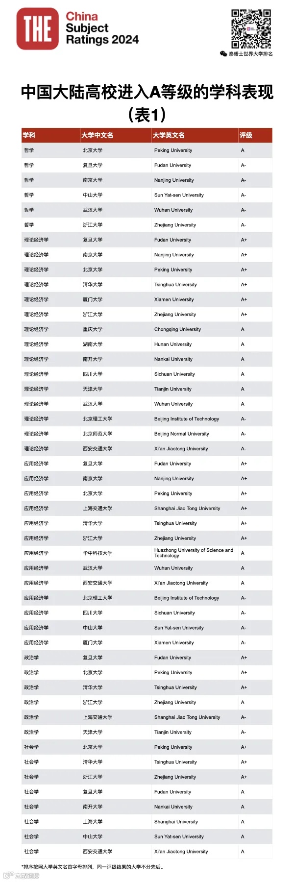 共有86所中国大陆高校获得评级,中国大陆的高校总共获得了534个A+评级,其中33所中国大陆高校在至少一门学科中获得了A+。 -