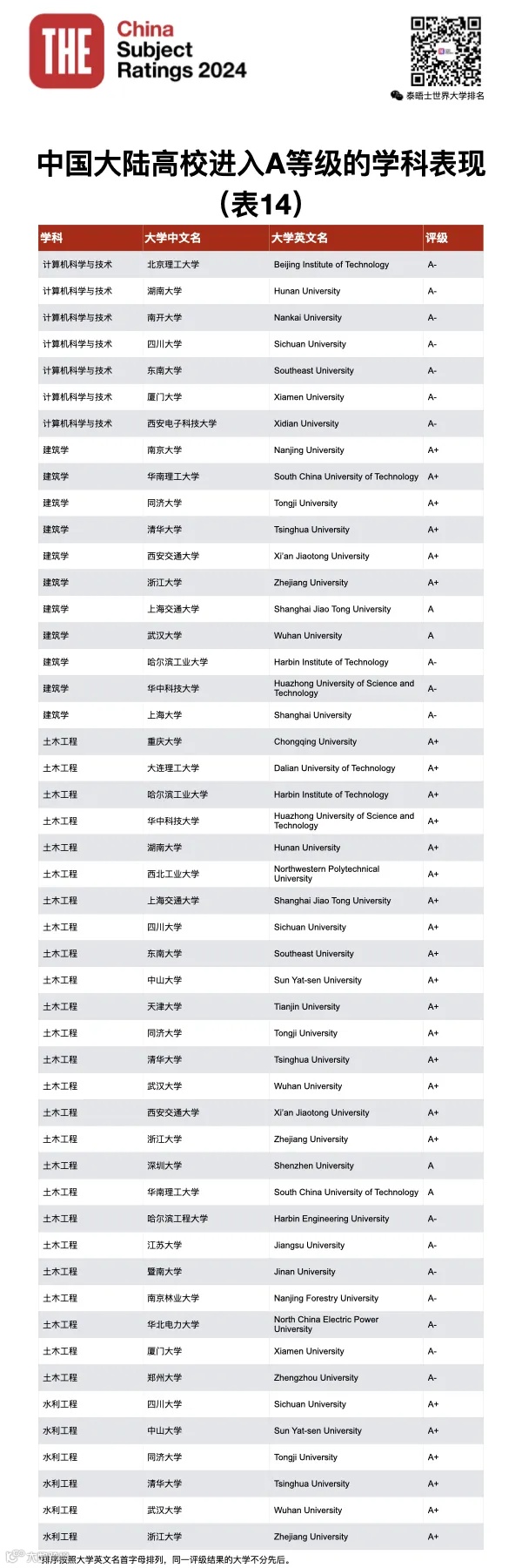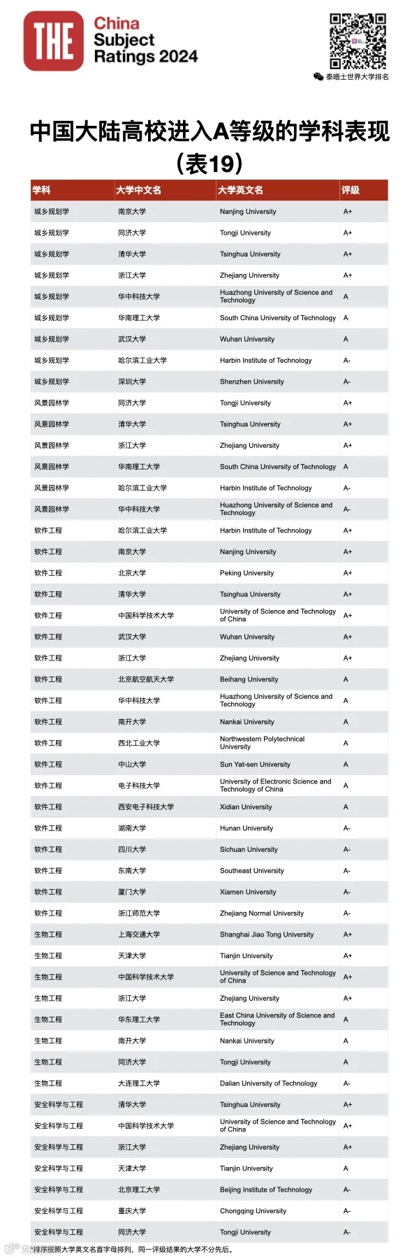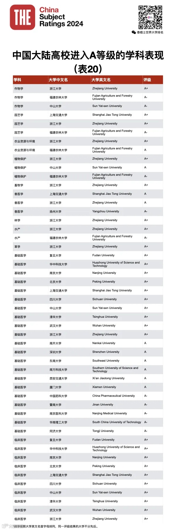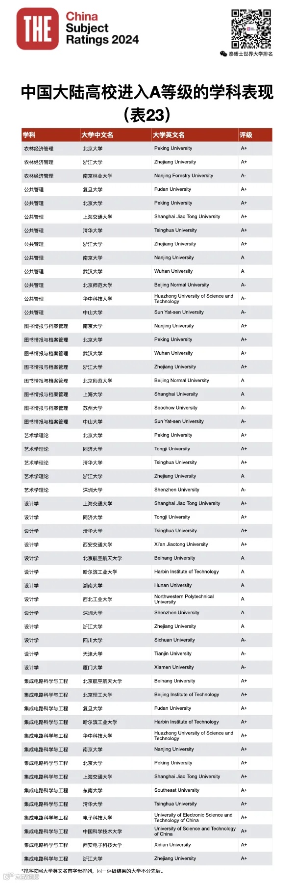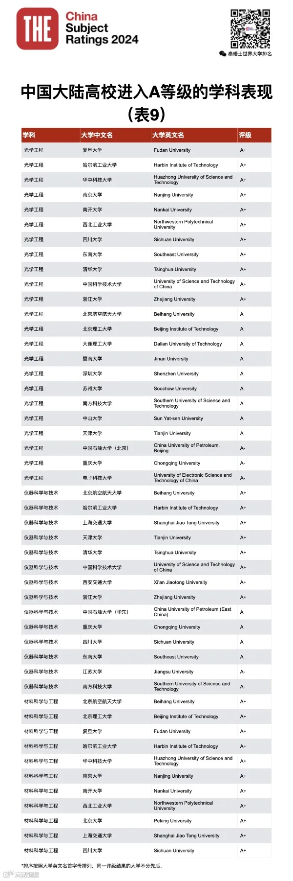 共有86所中国大陆高校获得评级,中国大陆的高校总共获得了534个A+评级,其中33所中国大陆高校在至少一门学科中获得了A+。 -