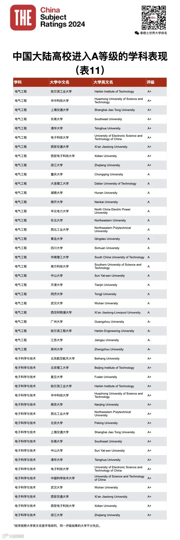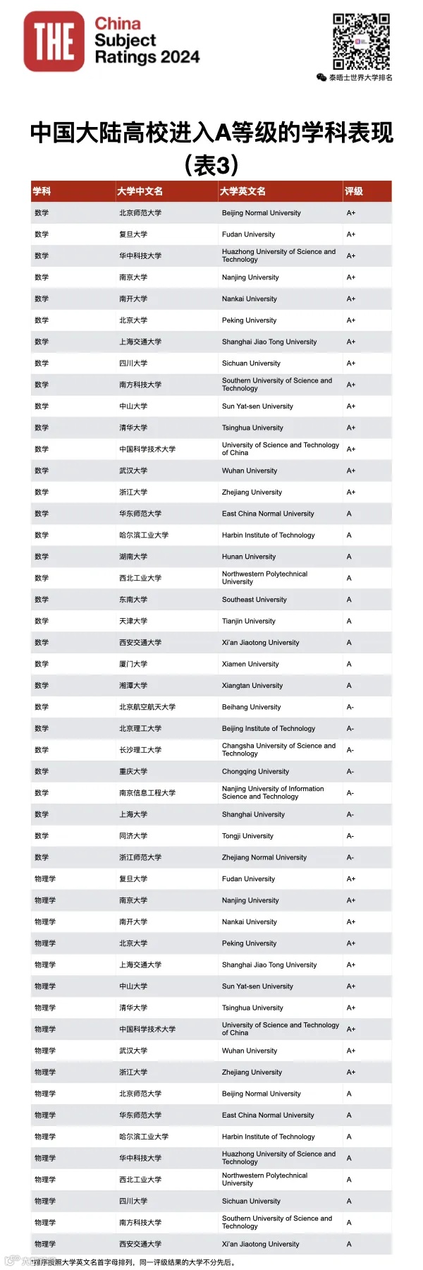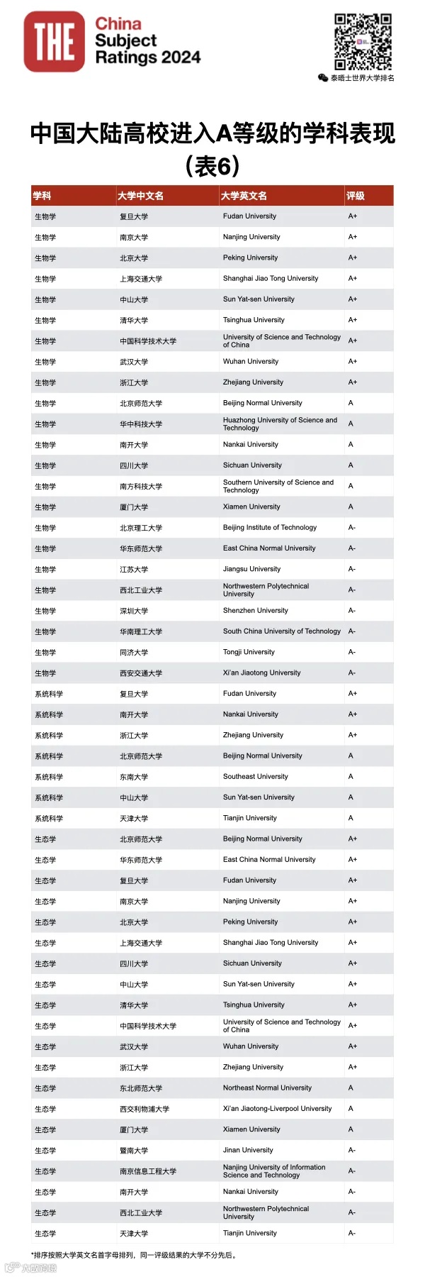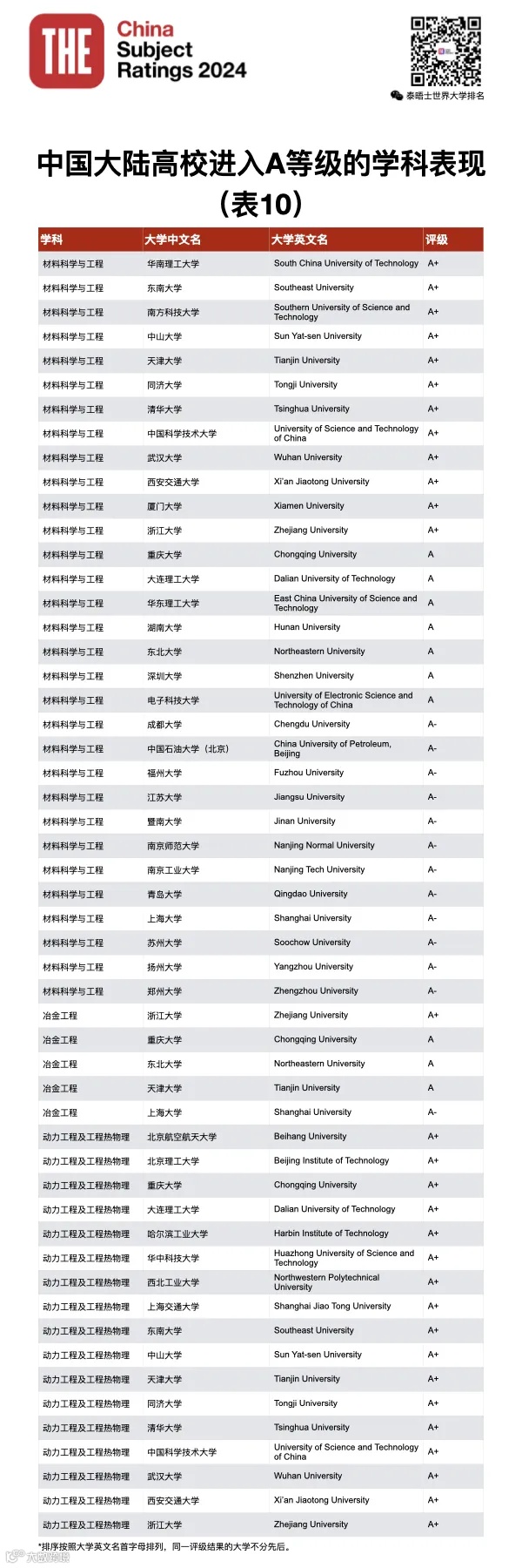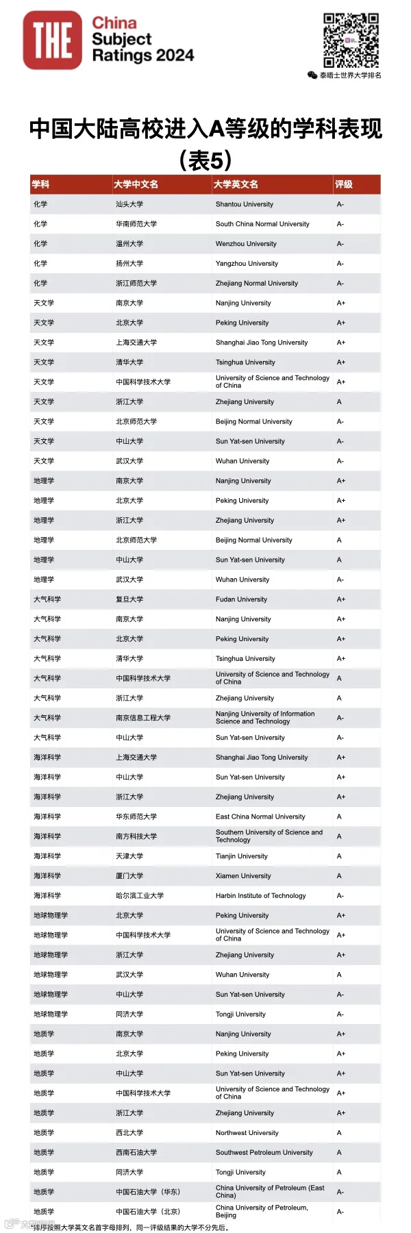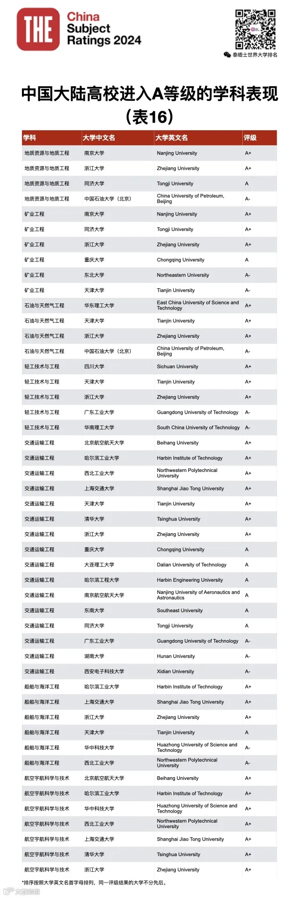 共有86所中国大陆高校获得评级,中国大陆的高校总共获得了534个A+评级,其中33所中国大陆高校在至少一门学科中获得了A+。 -