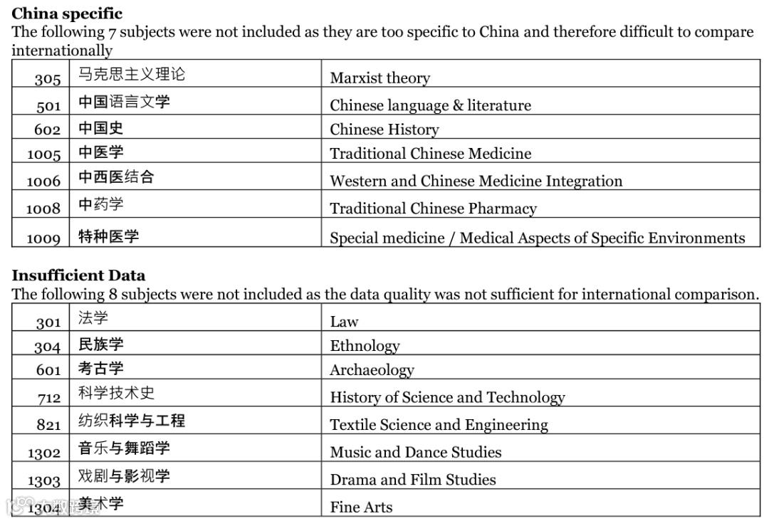 本次排名不包括15门强烈围绕军事和/或国家安全主题的学科,以及7门过于中国特有的学科,因为很难将它们与国际高校进行比较。还有8门学科不被包含,则是因为数据质量不足以进行国际比较。