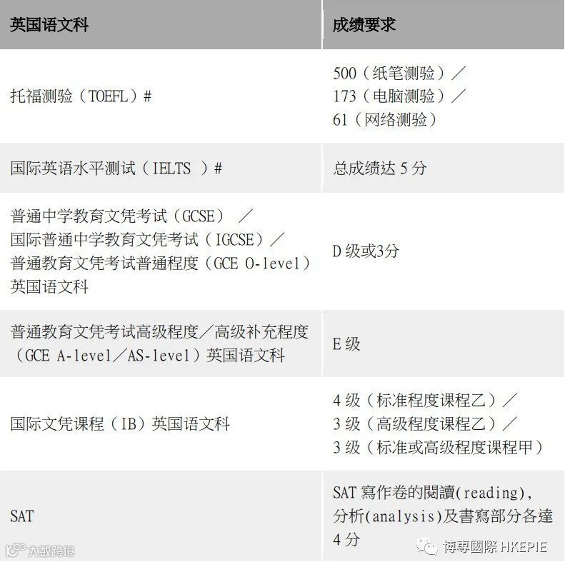高考英语成绩须达80分或持有本院认可的英语测试学历(详阅下图);及