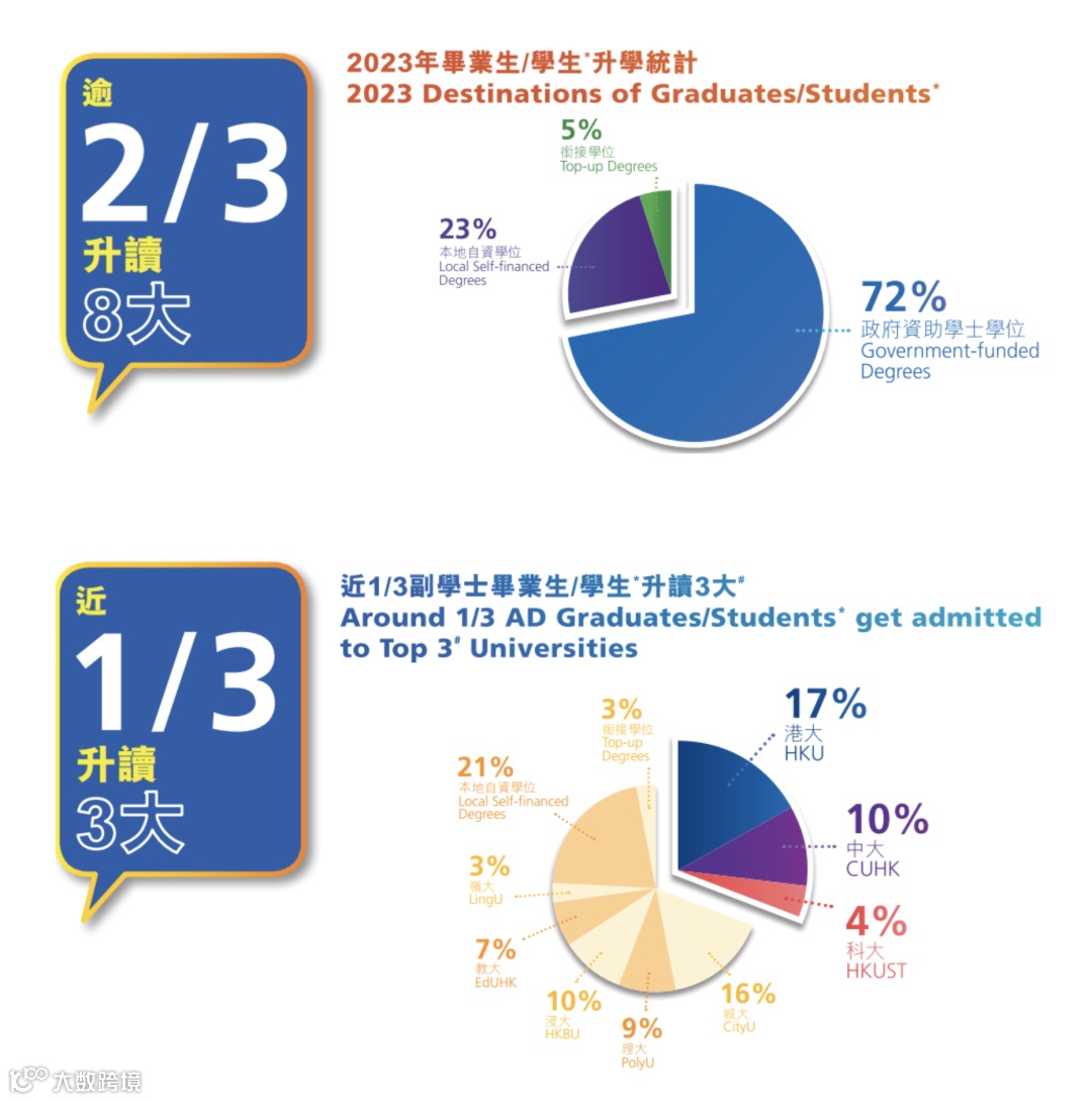 根据香港大学附属学院提供的最新数据,2023年有超过三分之二的学生能够升读香港前 8 大的政府资助学位。
