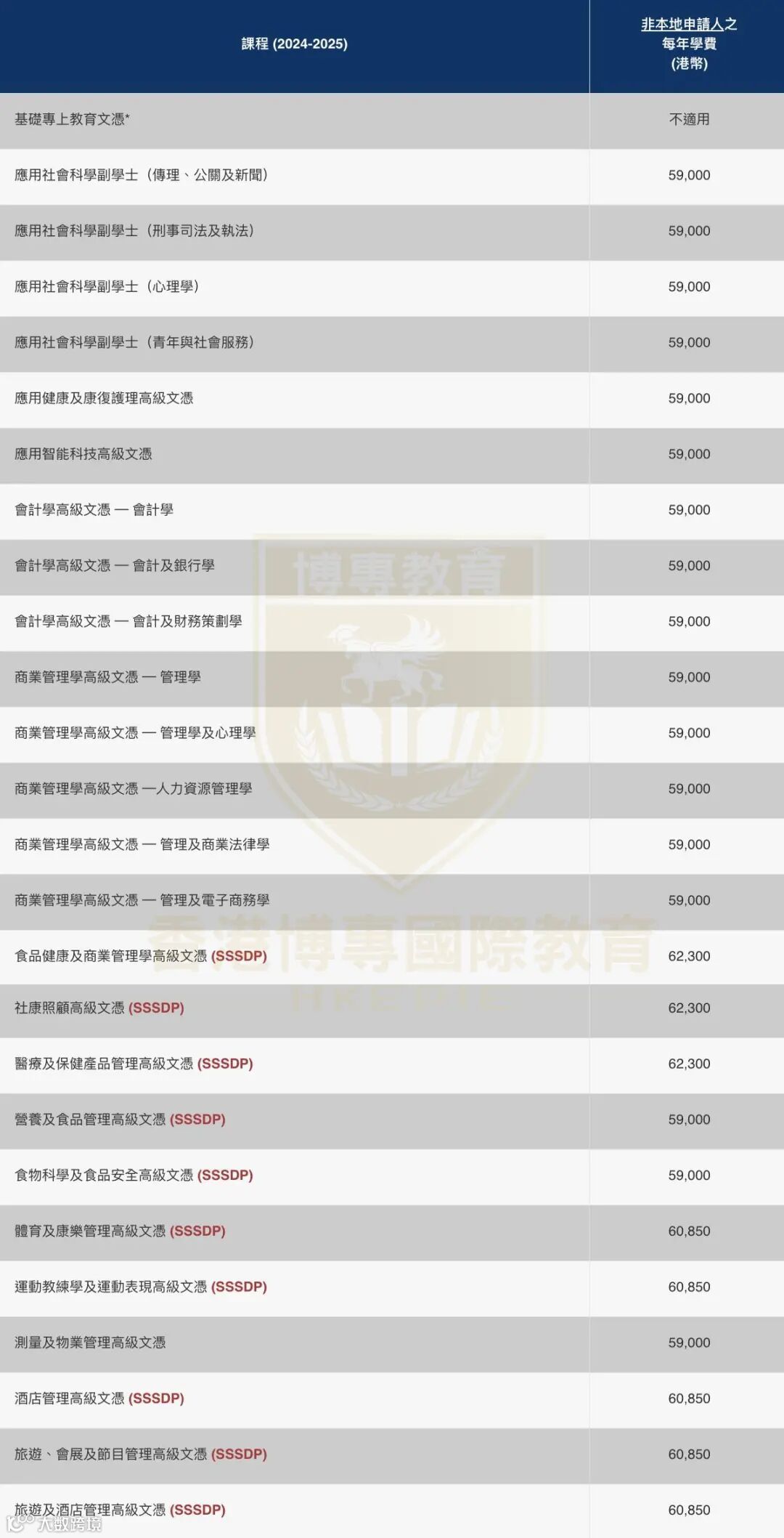 本校副学位课程两学年为基础。每个学年收费HK&59,000 - 62,300。