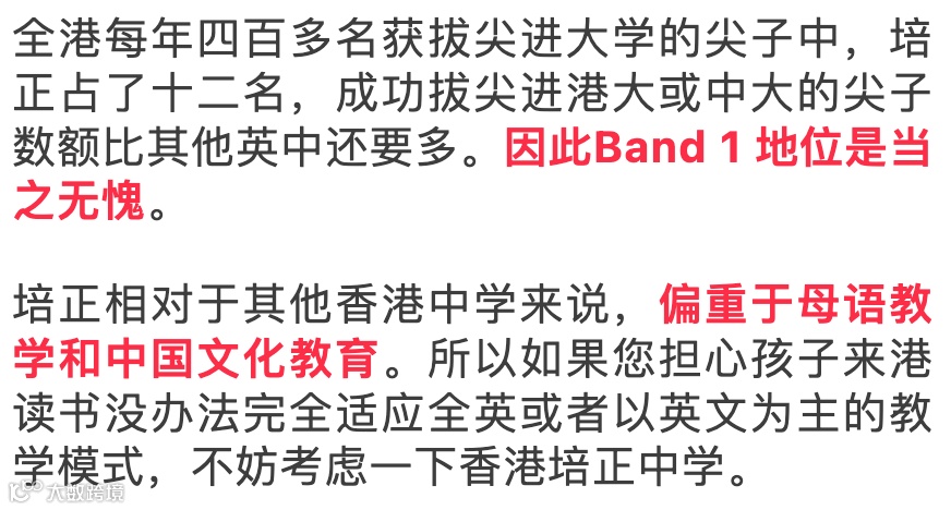 香港的主流名校都是英中,而培正是唯一一所Band1级别的中文中学,以粤语教学为主,部分科目用英语。数学科全部采用英文课本,高中部分选修科会采用英文课本,以英文为主辅以中文。