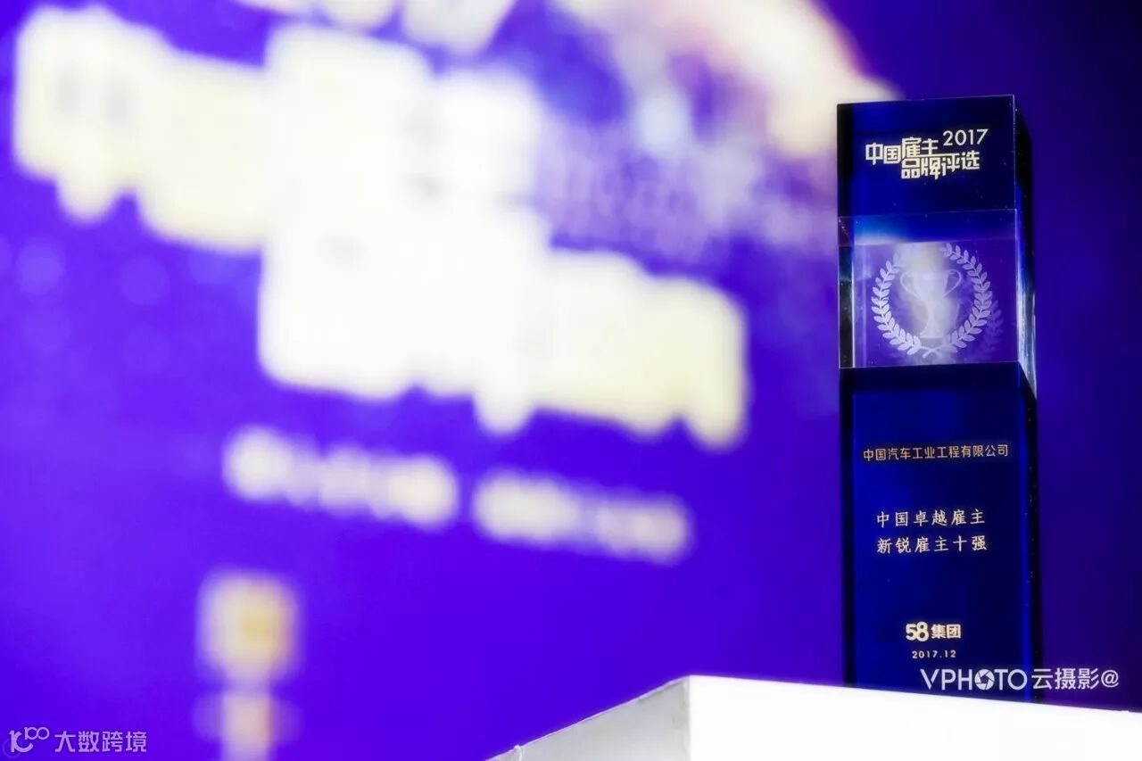 2017年12月14日,“2017年中国雇主品牌盛典”颁奖礼在北京隆重举办,人力资源部姬美婷受邀参加。此次盛典活动现场揭晓了“中国卓越雇主”、“第十五届中国大学生最佳雇主”和“海外留学生最佳雇主”三大榜单。中汽工程凭借公司优秀的企业文化,良好的工作环境,持续改进的人才引进机制和规范的人才培养管理荣获“中国卓越雇主新锐雇主十强”奖项。这是公司继2016年荣获“中国大学生最佳雇主风尚奖”后再次入围雇主品牌奖项评选。