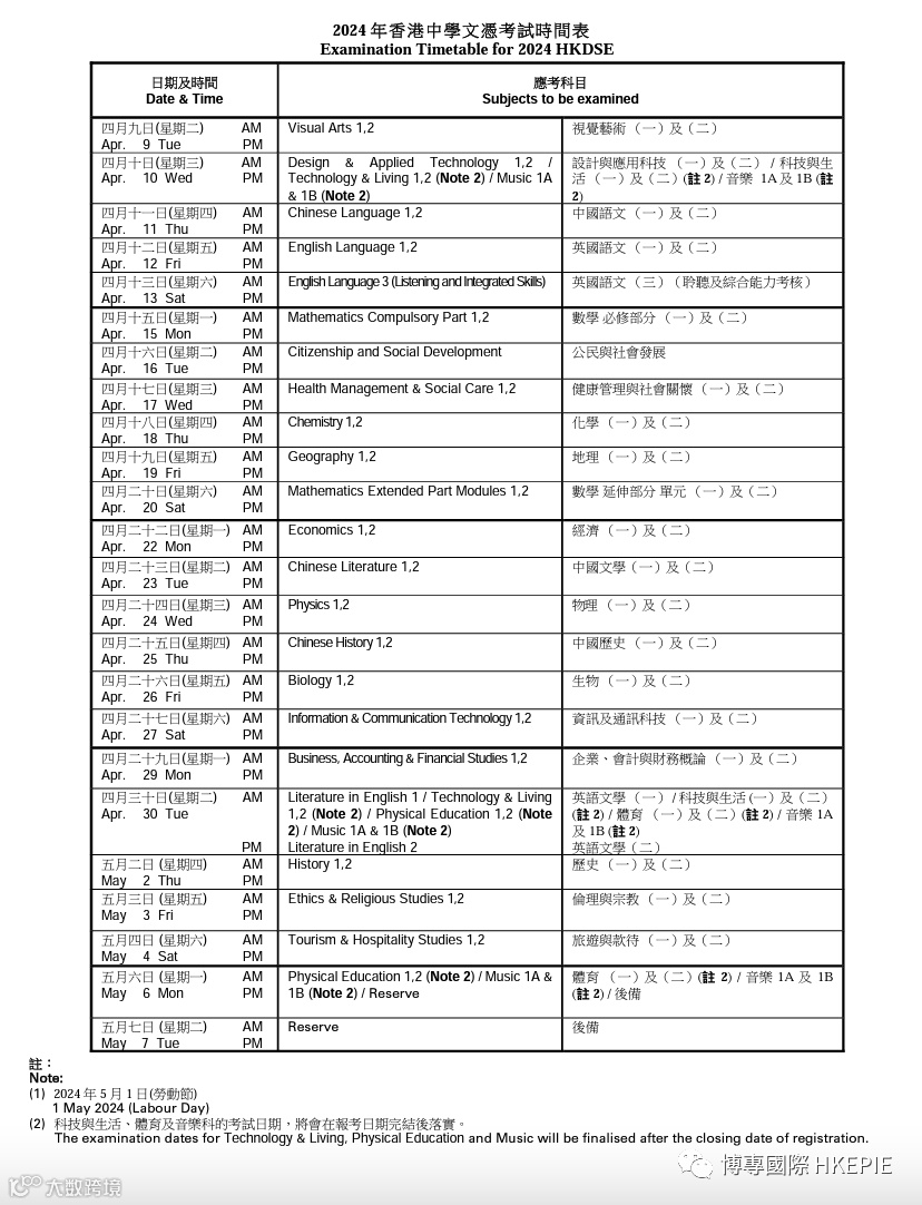 2024年DSE考试日期及放榜日期: