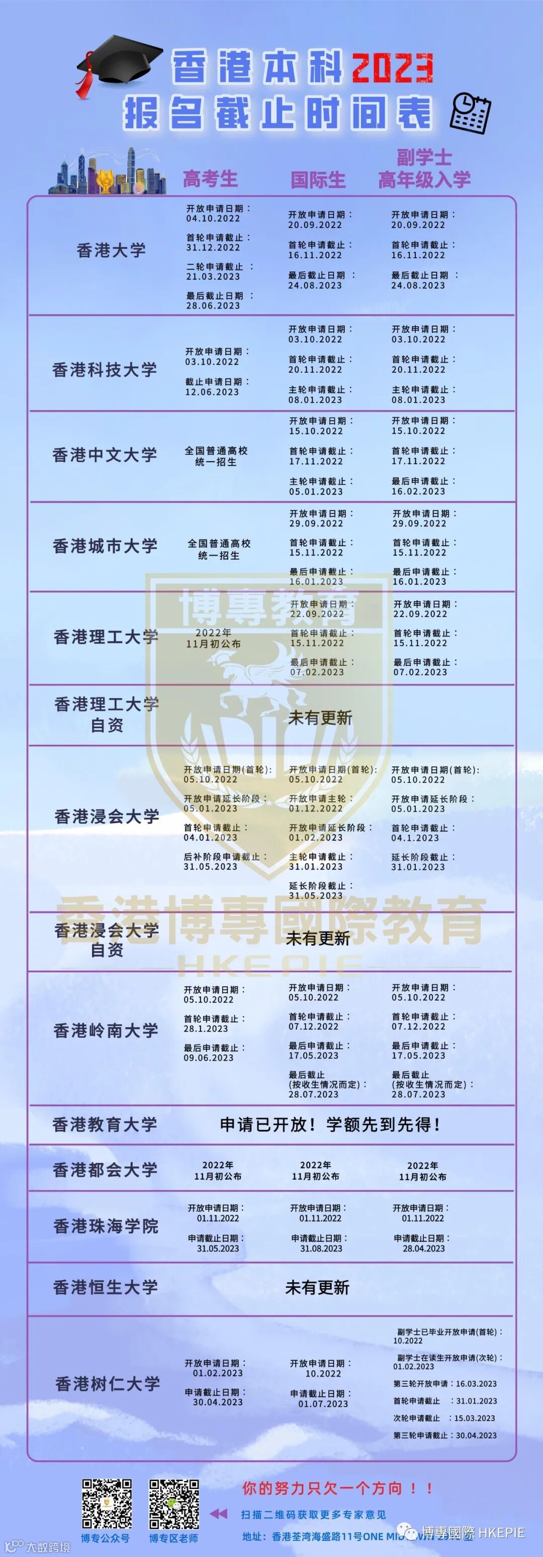 这个申请截止时间同学们也可以给自己一起读副学士的朋友们看看。有些同学后知后觉错过申请时间,或者冲冲忙忙才准备申请导致自己原本能进的大学最后拿不到录取,是真的非常可惜、也非常扎心的,要记住,你的努力只欠一个方向!不要白白浪费你这段读副学士的努力。