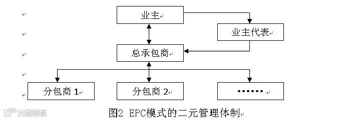 在图2中,EPC模式采用由业主和总承包商组成的二元管理体制。业主和总承包商之间是合同关系。EPC模式的二元管理体制有以下特点: