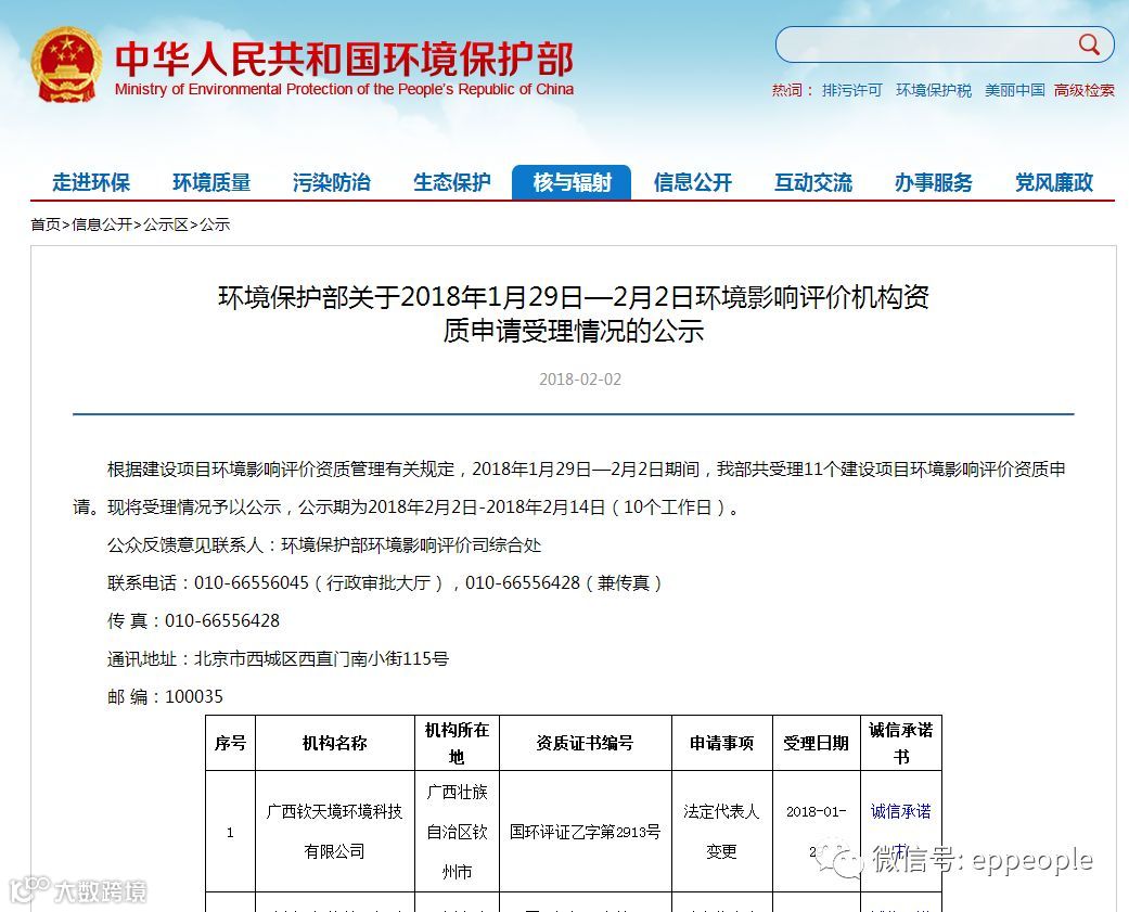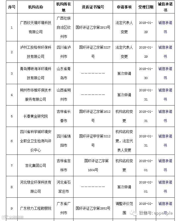 环境保护部关于2018年1月29日—2月2日环境影响评价机构资质申请受理情况的公示