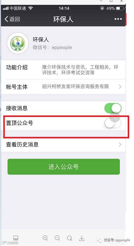 3成功置顶环保人公众号之后,灰色标志会变成绿色,如下图:
