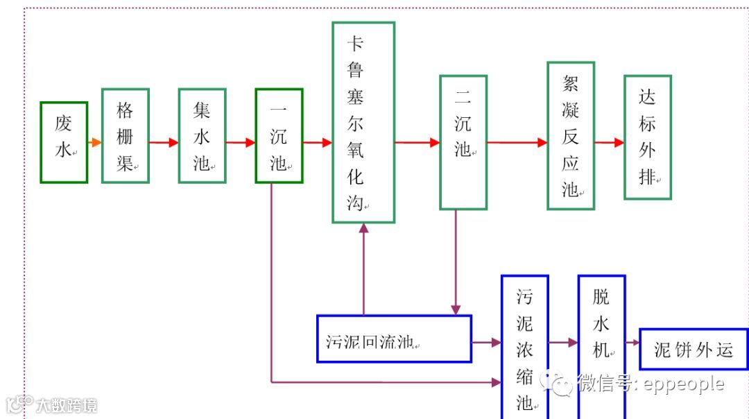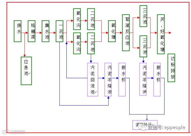 全厂废水进入格栅渠,去除大块渣子,接着进入集水池,由泵提升到一沉池,然后分别流入两组卡鲁塞尔氧化沟(2000m3/组),经好氧处理后,进入二沉池泥水分离,汇总后流入氧化塘,再进入絮凝反应池,投加PAC、PAM,充分反应后,进入两组三沉池进行泥水分离,上清液再经厌氧塘、好氧塘、植物塘处理,最终达标排放。