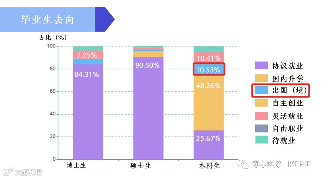 从出国留学率上看:留学率最高的是中国人民大学,有794人选择出国留学,占比超过30%。有57%去到了QS排名世界前100的大学读硕士。