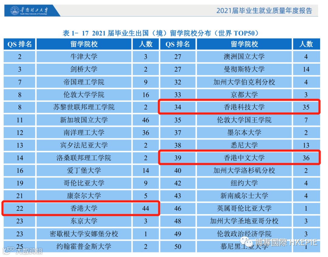 2021年,华南理工大学 有 633 名毕业生选择出国(境)留学,中国香港成为第一大目的地,有157人选择赴港,占比高达24.80%。
