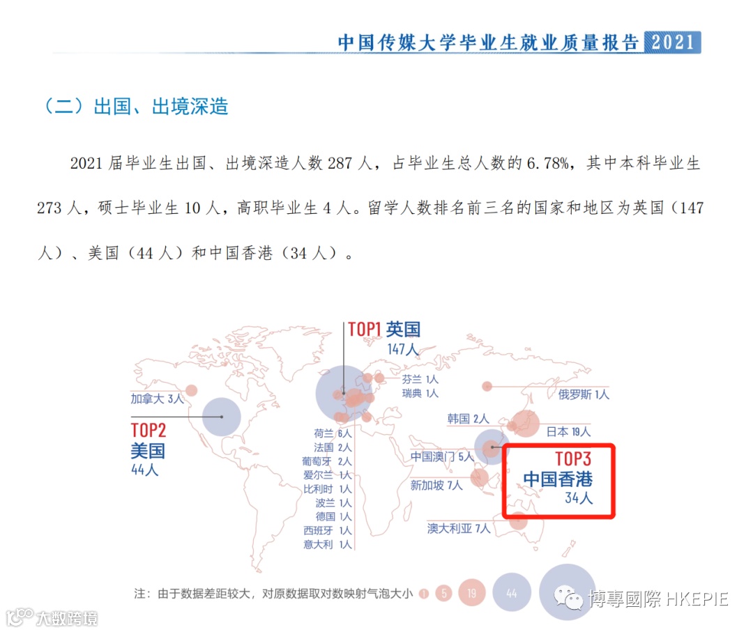 中国传媒大学 2021 届毕业生出国、出境深造 287 人,占6.78%。