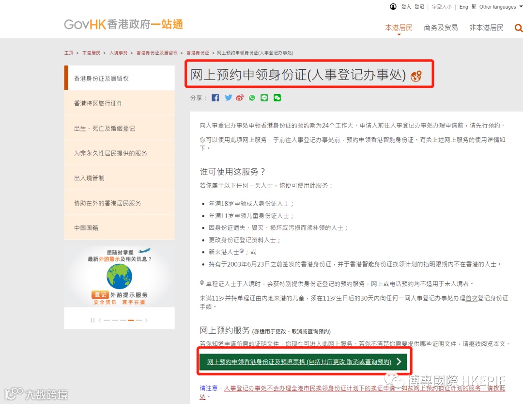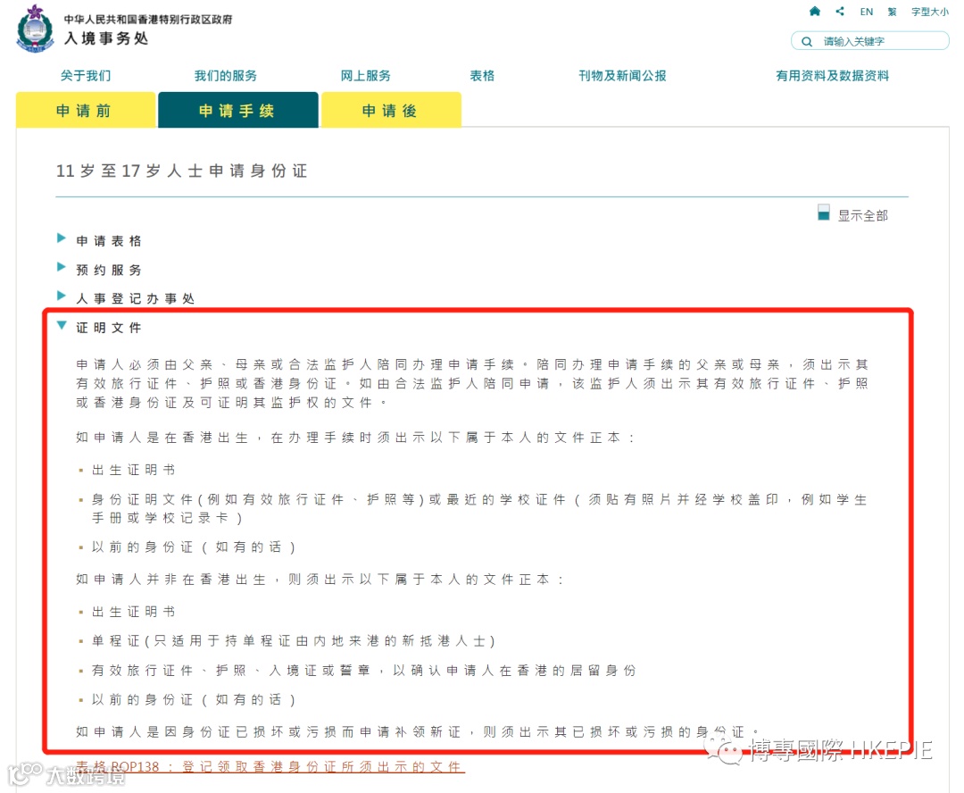 根据香港《人事登记条例》,除获豁免或无须登记的人士外,凡年满11岁或以上的香港居民(包括获准在香港逗留超过180天的人士),均必须在入境后30天内,前往香港特区入境事务处的人事登记办事处申请身份证。