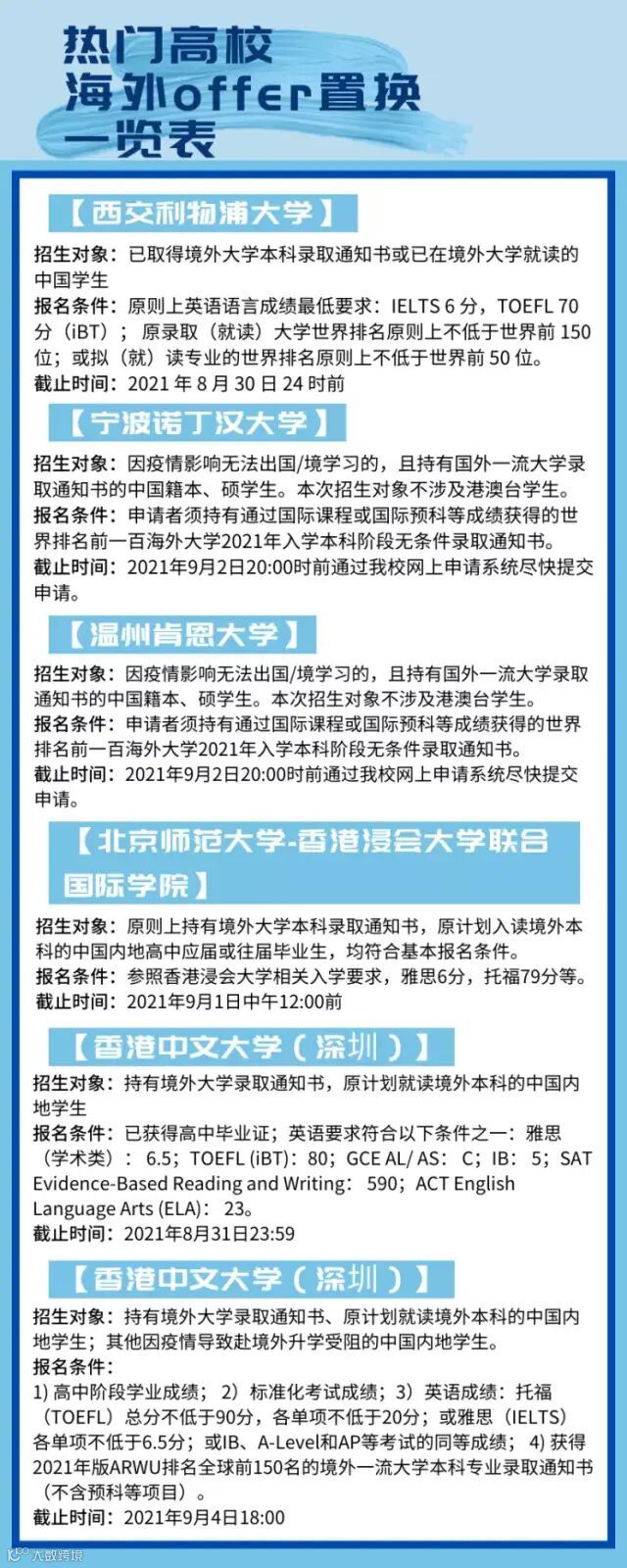 以下是热门高校海外offer置换条件一览表: