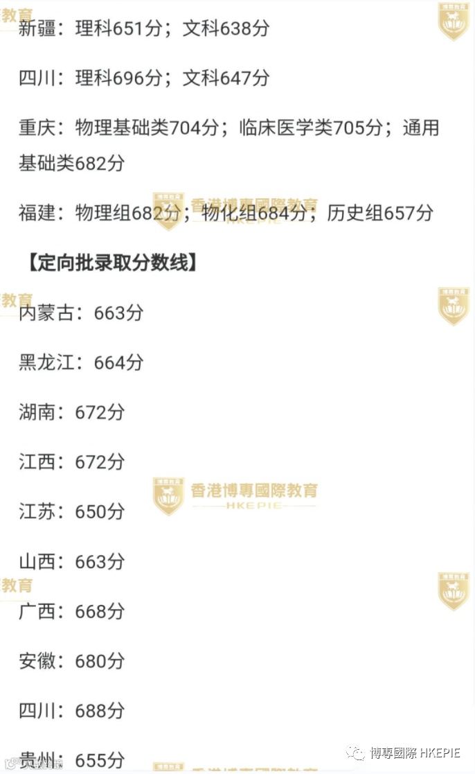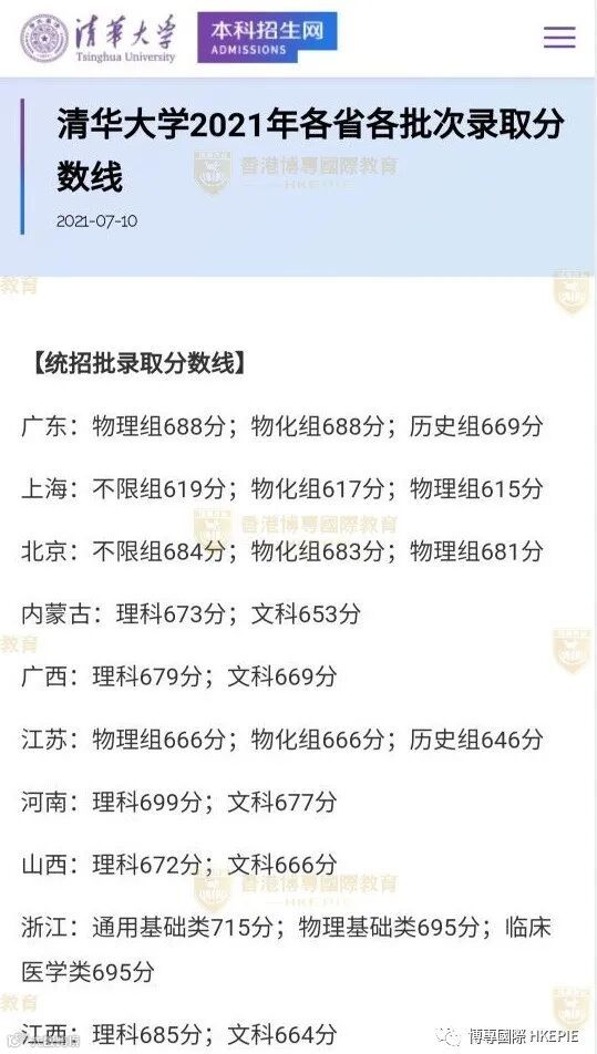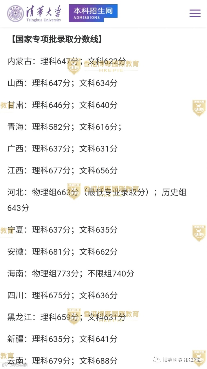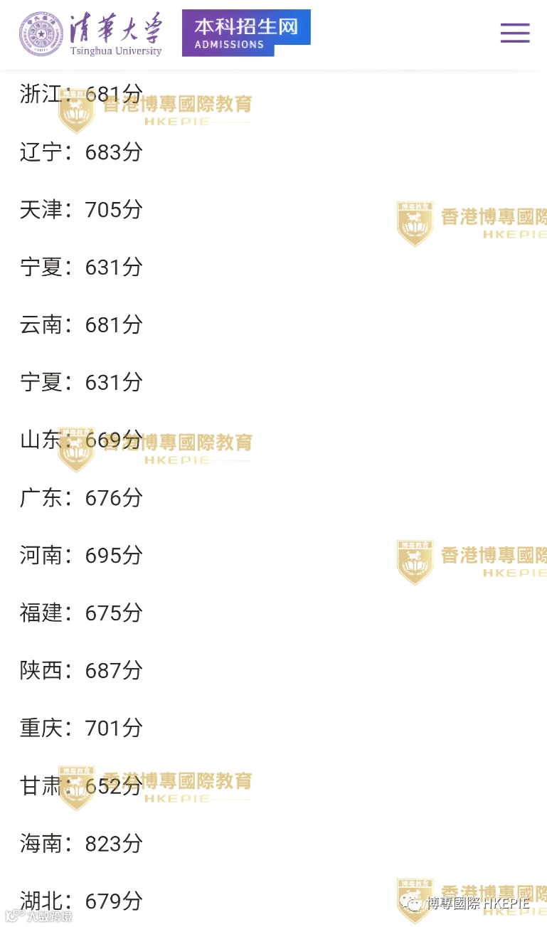 香港大学的世界排名跟清北相若,所以录取分数肯定是香港所有大专院校最高的。而跟2021年清华大学的录取分数线也差不多,小伙伴们可以参考下图: