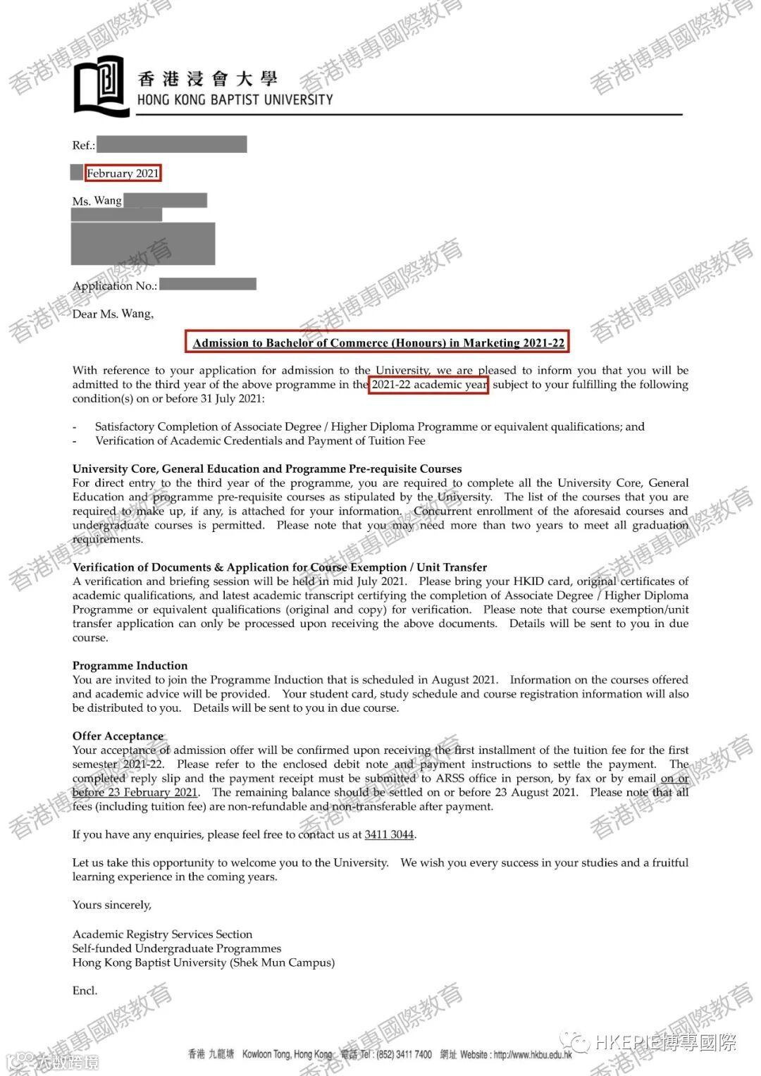 王同学两年前到香港就读香港大学副学士,截至今天,她已经斩获了香港城市大学、香港理工大学跟香港浸会大学的本科获取通知。从二本线成绩生一跃成为985大学本科生。