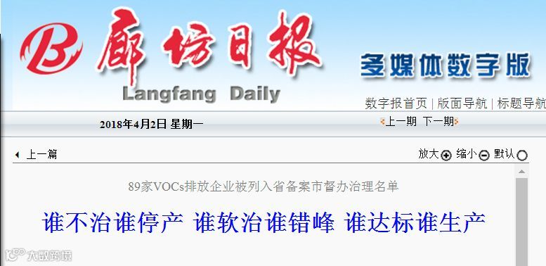 “新地标”出台以来,我市认真落实国家、省安排部署,出台了《廊坊市2016年挥发性有机物治理工作实施方案》,配套制定了《廊坊市重点行业VOCs达标治理工程验收管理办法》,印发了《关于落实省重点行业挥发性有机物达标治理工作任务的通知》等系列文件,并通过《廊坊日报》《廊坊都市报》和廊坊电视台等媒体先后数十次向社会公布了省、市政策要求和我市具体安排部署,重点强调:自2017年1月1日起,未完成治理、不能达标排放的企业,一律停产。