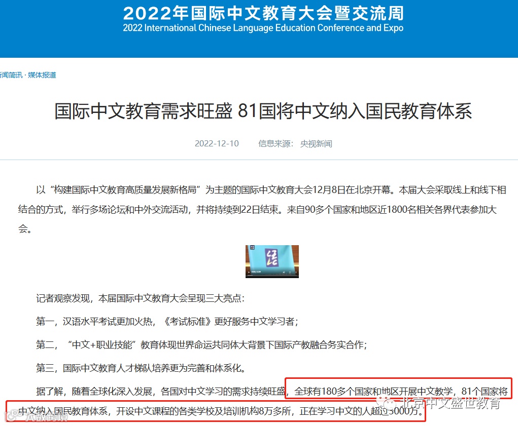 截至2022年底, 10个联合国下属专门机构将中文作为官方语言,全球有81个国家将中文纳入国民教育体系,中国以外正在学习中文的人数超过3000万,累计学习和使用中文人数近2亿。