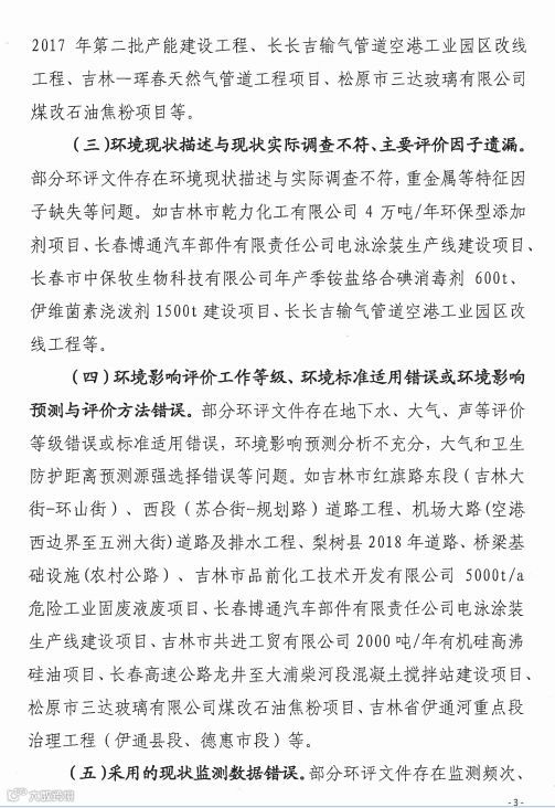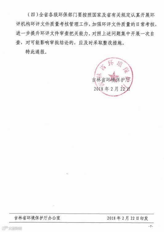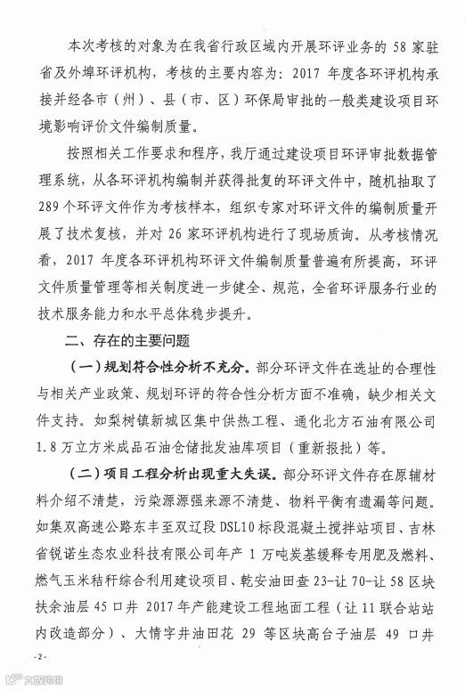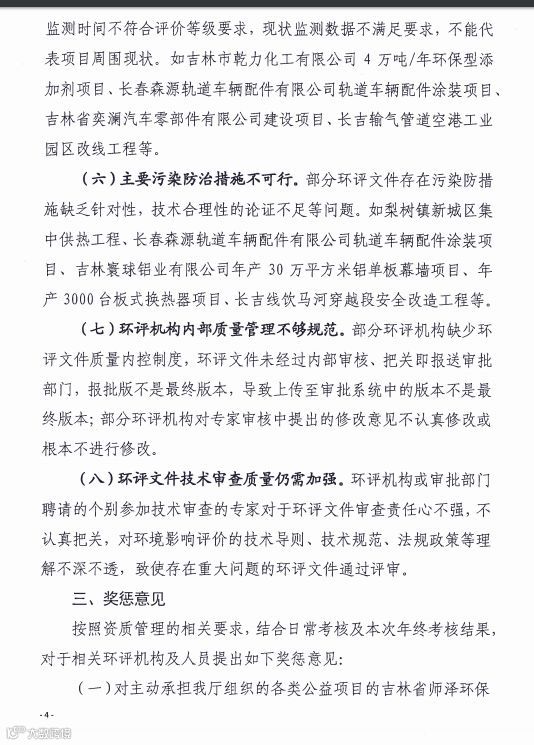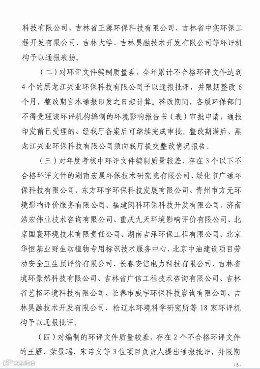 根据《吉林省环境保护厅关于2017年度全省环境影响评价机构年终考核情况的通报》(吉环管字[2018]6号)结果,吉林省环境保护厅做出了对黑龙江兴业环保科技有限公司1家环评机构予以通报批评,并限期整改6个月,整改期间,各级环保部门不得受理该环评机构编制的环境影响报告书(表)审批申请;吉林省环境保护厅做出了对王雁、荣景瑶、宋连义等3位项目负责人提出通报批评,并限期整改6个月,整改期间,各级环保部门不得受理该工程师作为项目负责人编制的环境影响报告书(表)审批申请;吉林省环境保护厅对张雪梅、唐征雄、吕在文、李俊英、吴士斌、吴航、王丹、陈胜铨、于环、沈兰华、黄美芬、刘世安、李超平、沈庆海、吴小华、贾生元、黄军荣、李宏伟等18位项目负责人提出通报批评,并限期整改3个月,整改期间,各级环保部门不得受理该工程师作为项目负责人编制的环境影响报告书(表)审批申请;整改日期以通报印发之日起计算,通报印发前已受理的,经吉林省环境保护厅备案后可继续完成审批。