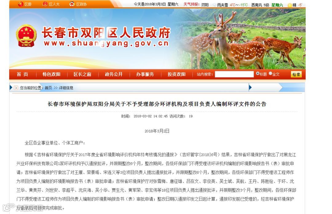长春市环境保护局双阳分局关于不予受理部分环评机构及项目负责人编制环评文件的公告