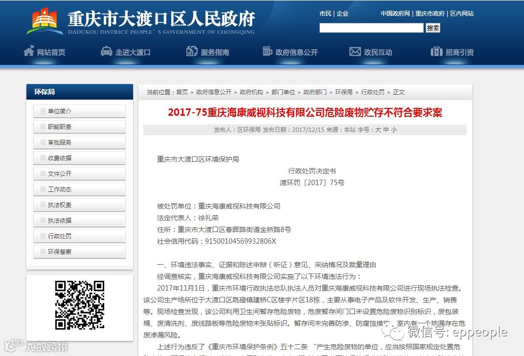 经调查核实,重庆海康威视科技有限公司实施了以下环境违法行为: