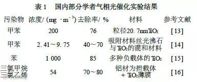 国内对于TiO2光催化应用于废气处理还比较少见,近几年主要针对室内空气和低浓度苯系物作了初步实验研究和动力学探讨,详见表1。