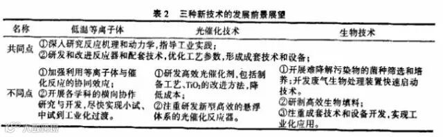 综合上述,低温等离子体、光催化技术和生物技术对处理低浓度VOCs废气在技术上是可行的,特别是它们安全、高效、低能耗、无二次污染等优点,其应用前景均十分广阔;但目前国内它们不是还停留在实验研究阶段,就是还没有成为成熟技术,实现工业化应用还有大量工作要做。鉴此,作者提出三种新技术的发展前景展望如表2。