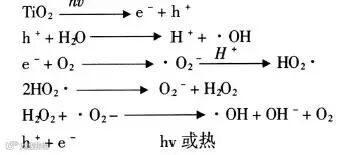 纳米TiO2为n-型半导体,具有三种不同晶相结构:锐钛矿型(Anatase)、板钛矿型(Brookite)、金红石型(Rutile)。其中锐钛型TiO2具有较高的光催化氧化能力,其禁带宽度为Eg=3.2eV,相当于波长为387nm光的能量,处于紫外区。在紫外光作用下它的价带上的电子(e-)就可以被激发跃迁到导带,在价带上产生相应的空穴(h+),随后h+和e-与吸附在TiO2表面上的H2O,O2等发生作用,生成˙OH,˙O2-等高活性基团,当然产生的空穴和电子还有复合的可能。其机理如下: