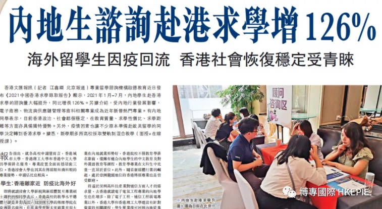 近期《大公报》一则报道也指出,2021年1-7月内地学生赴香港留学的咨询量大幅提升,同比增长126%。