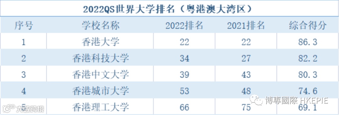 港大排名22,港科大34,港中文39,港城市53和港理工66。