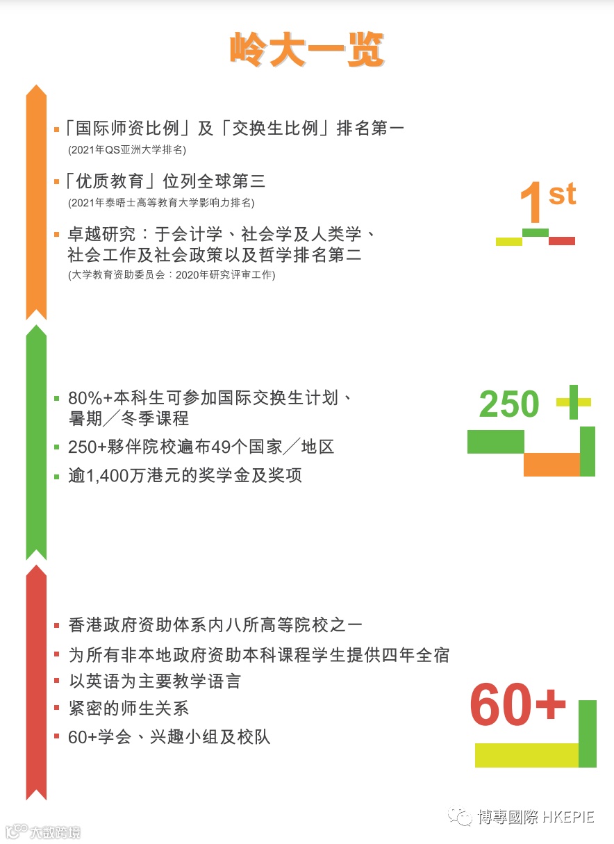 在2021年泰晤士高等教育大学影响力排名中的「优质教育」名列全球第三;而在2022年QS世界大学排名,岭大在「国际师资比例」占第33位。