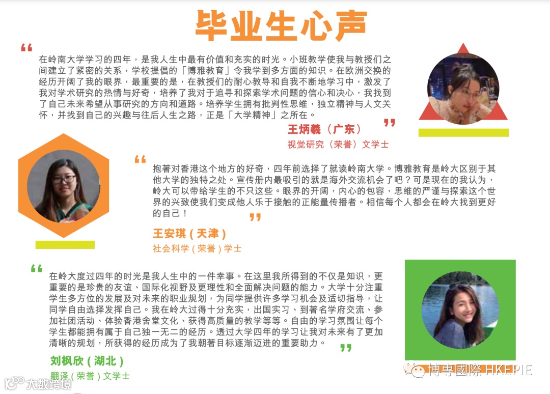 香港岭南大学成立于1888年,是亚洲博雅大学联盟创始成员以及世界博雅院校联盟的认证会员。是一所规模精细、设备齐全、师资卓越的大学,以博雅教育为使命,专业与通才训练并重,促进学生的全人发展。岭大专注于人文社会学科,课程以基础宽广、跨学科研习为特色,旨在引导学生成为一位“学识广博,生活高雅的自由人”。
