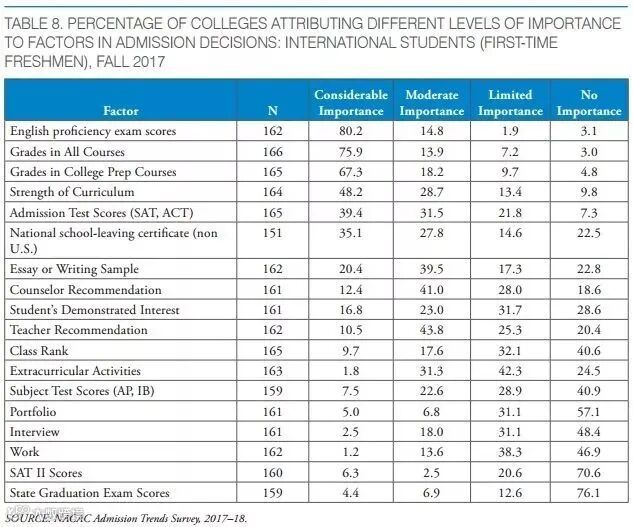 我们为大家列出了美国大学招生咨询委员会NACAC公布的报告,对于国际生,影响录取的主要因素有以下几点: