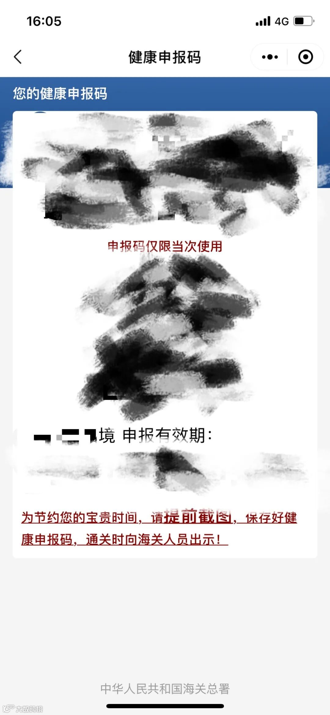 小程序【海关旅客指尖服务】-【健康申报/修改健康申报】,填完截图黑码。