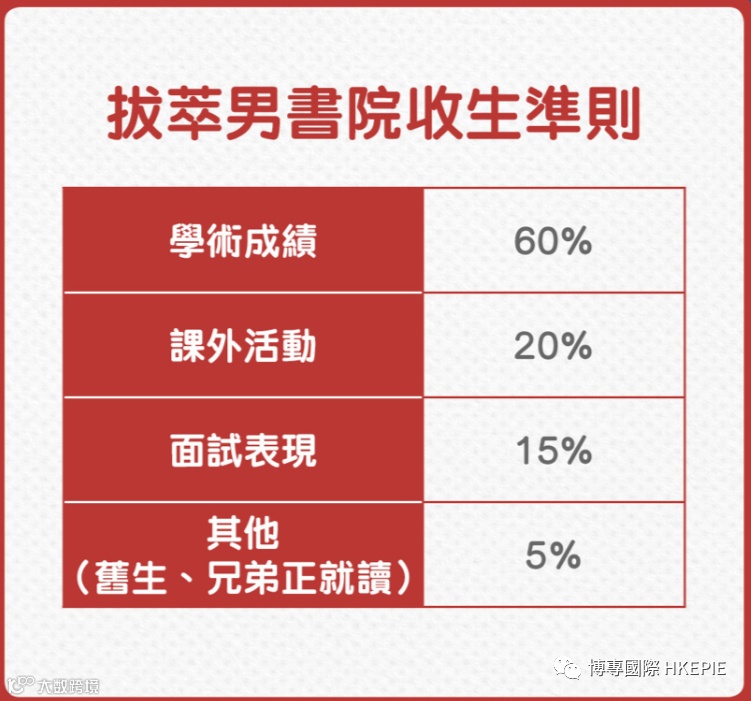 虽然拔萃男书院今年没有举办中一简介会,不过每年的面试其实大同小异,参考过往简介会的内容拔萃男书院每年约1500个同学申请报读中一,减去附属小学的学额,每年会剩余约100个名额供其他小学的毕业生申请。学校会在约1500位申请人当中,筛选约500人进入面试环节,而占校方考量最重的是成绩,占整体60%,面试表现只15%,最后录取100名学生。