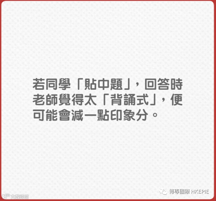 朗读完成后,便会进入谈话环节,在英文面试的谈话环节中,老师除了可能会问及刚才朗读文章的内容外,更多会询问同学周边的事情、学习经历、兴趣、时事议题等。若同学「贴中题」,回答时老师觉得太「背诵式」,便可能会减一点印象分。