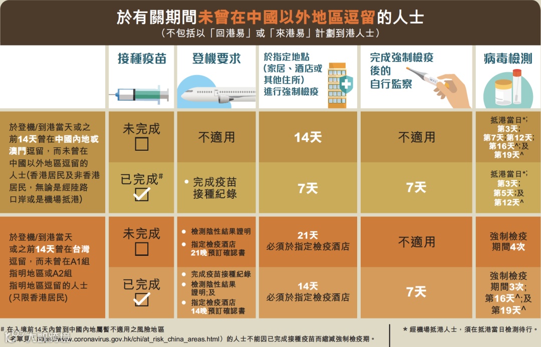 如果抵港前14天,完成接种疫苗,只需要强制隔离7天,并在到达香港的第3天、第5天及第12天接受核酸检测。