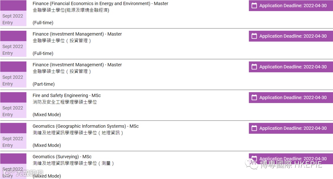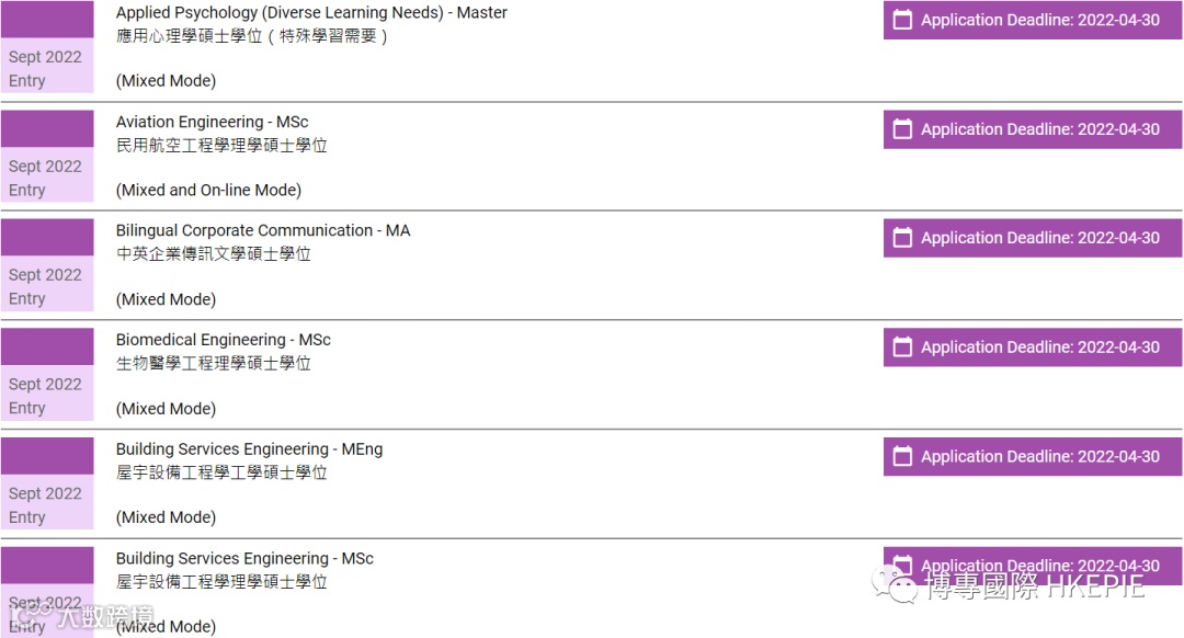 香港理工大学最近已经全面开放2022年授课型硕士申请,包括春季入学项目以及秋季入学项目。大部份的专业的截止申请日期为2022年4月30日,但其中也有小部分的截止申请日期不一样。