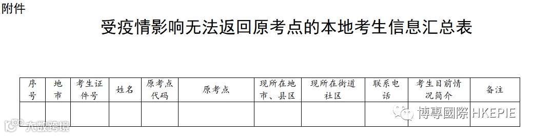三、原则上由此类考生原报名所在地市招生考试机构汇总相关考生信息。各地市招生考试机构要安排专人抓紧摸查本市此类考生情况,确保无一遗漏。相关考生汇总表请于6月4日下午18时前,上报省教育考试院(考招一处)。上报格式见附件。