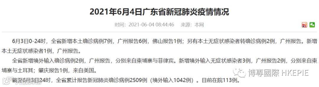 6月3日0-24时,全省新增本土确诊病例7例,广州报告6例,佛山报告1例;另有本土无症状感染者转确诊病例2例,广州报告。新增本土无症状感染者1例,广州报告。