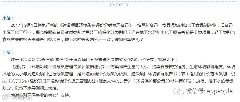 你于我部网站“部长信箱”来信“关于建设项目分类管理名录的疑惑”收悉。经研究,答复如下: