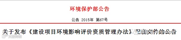 《建设项目环境影响评价资质管理办法》已于2015年4月2日由环境保护部部务会议修订通过,现予公布,自2015年11月1日起施行。原国家环境保护总局发布的《建设项目环境影响评价资质管理办法》(国家环境保护总局令第26号)同时废止。