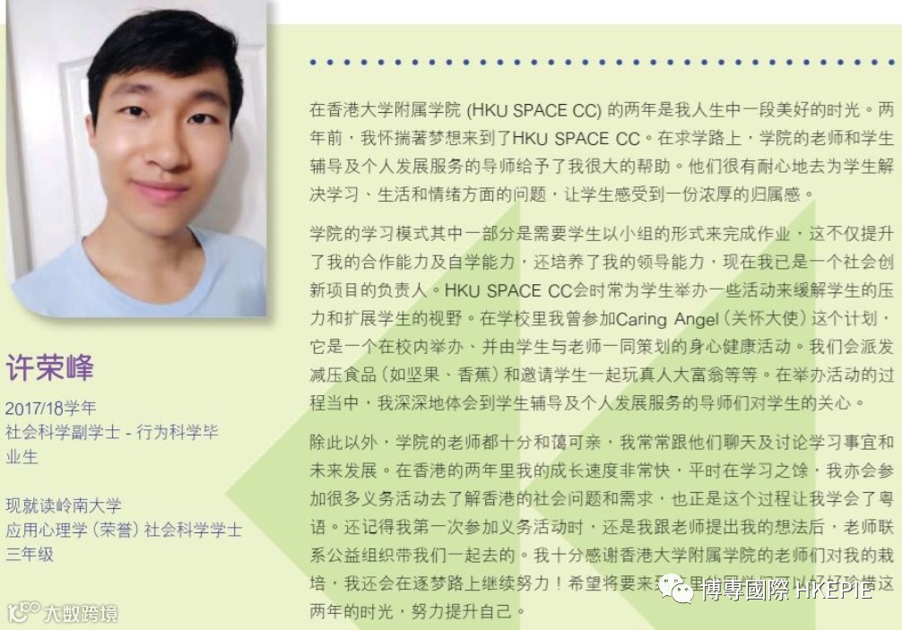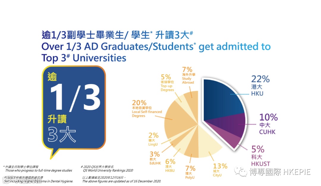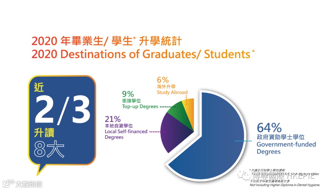 香港大学副学士的官网数据表明,有超过2/3的学生升读香港八大名校的学士学位,超过1/3的学生升读香港前三大的学士学位。