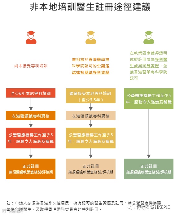 根据政府建议,当局会制定指定海外医学院院校名单,持香港永久居民身份证的合资格医生在公营医疗机构工作最少5年,便可以取得正式注册资格,换言之可于捆绑期后转为私人执业。
