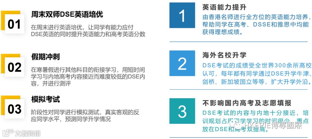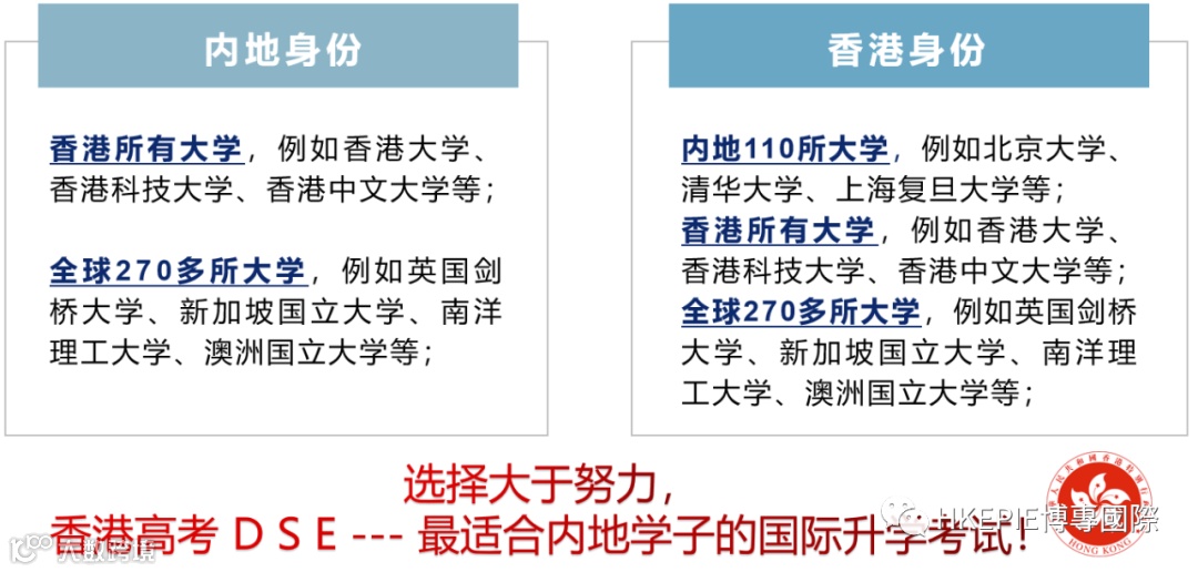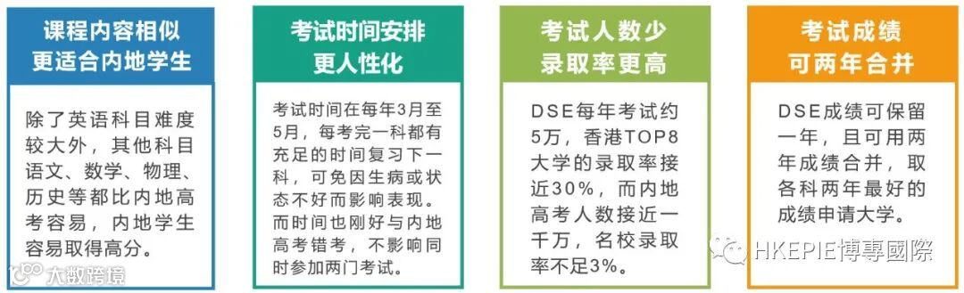 香港中学文凭考试( Hong Kong Diploma of Secondary Education Examination)(简称DSE),又称 香港高考或DSE考试,是香港本土学生考取香港大学的主要途径,此考试同时也对内地及全球 考生开放,只要符合资格均可报名参加考试,并用DSE成绩申请香港及全球 270 余所大学,其中包括香港大学、剑桥大学、新加坡国立大学、南洋理工大学、澳洲国立大学等世界名校 。