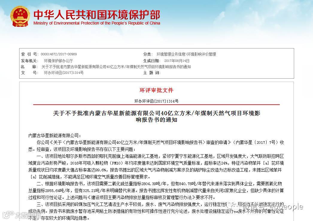 你公司《关于〈内蒙古华星新能源有限公司40亿立方米/年煤制天然气项目环境影响报告书〉审查的申请》(内蒙华星〔2017〕7号)收悉。经审查,该项目及环境影响报告书存在以下主要问题: